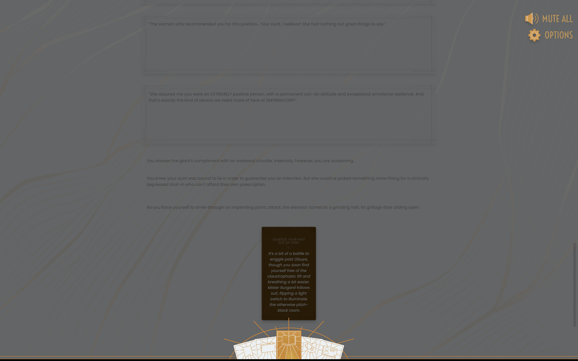 Take part in an expansive choose-your-own-adventure horror story, where you’ll uncover the secrets of an anachronistic corporation reigning over a post-truth world. Solve cryptic riddles, make difficult choices, and escape the depths of SMYRNACORP with your mind intact, no matter the cost.